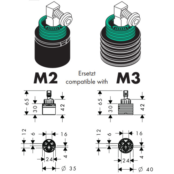 Совместимость: Заменяет картриджи типа M2 и M3 — универсальный вариант для смесителей Hansgrohe, выпускаемых с сентября 1997 года